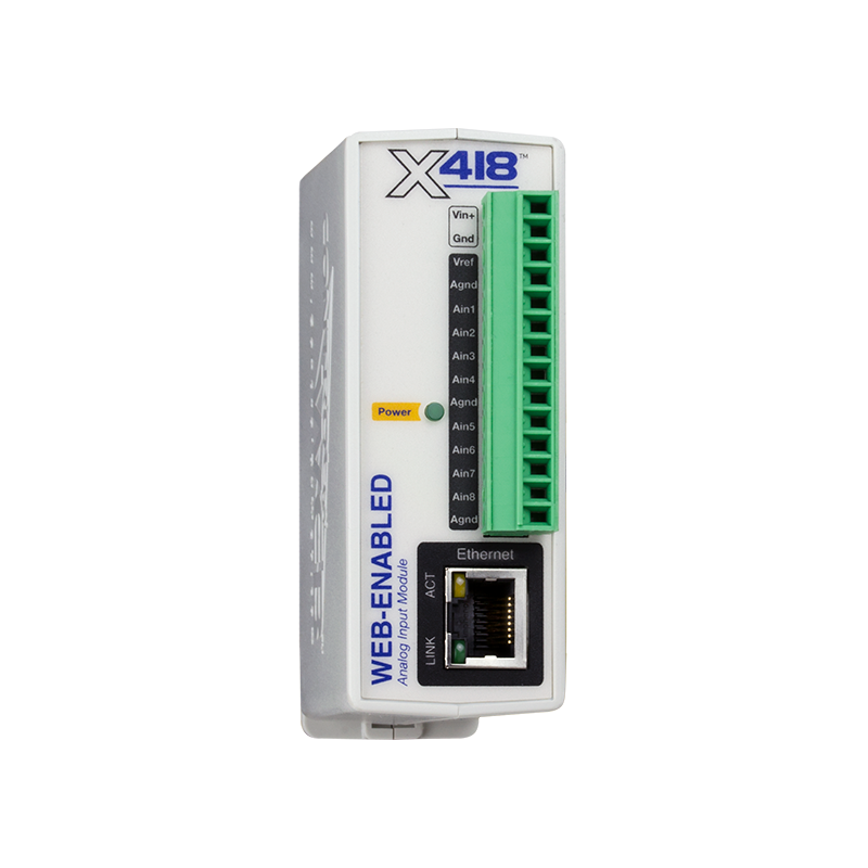 X-418-I er et fuldt udstyret, Ethernet dataopsamlingsmodul med en innovativ løsning til oprettelse af logiske opgaver uden behov for scripting.