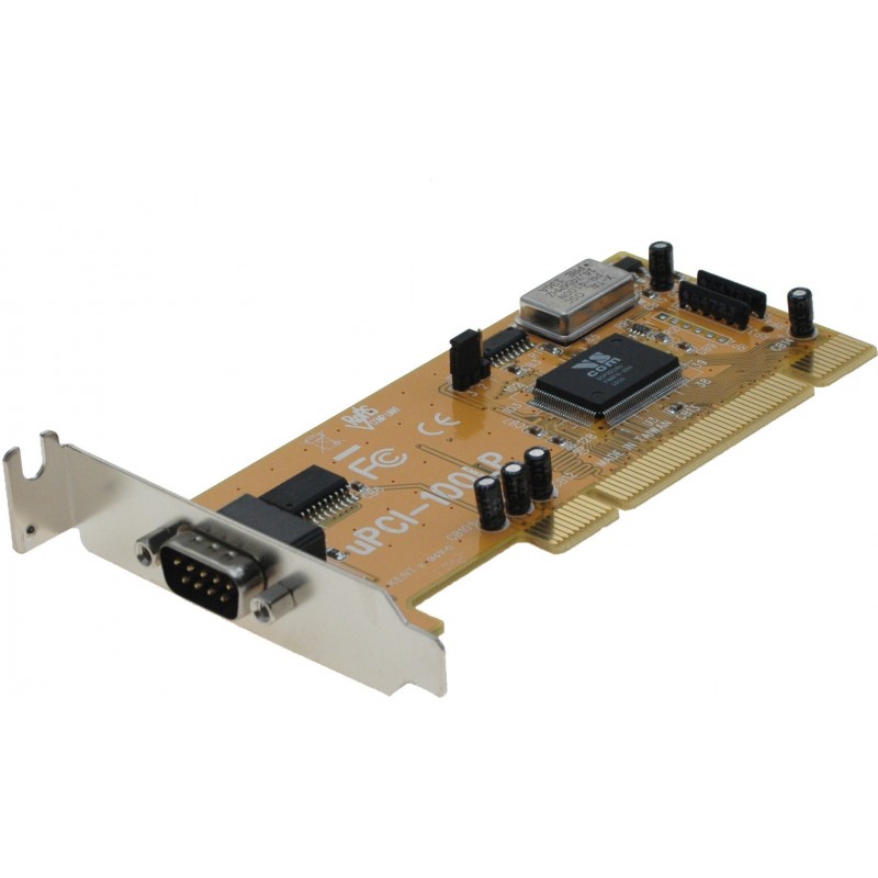 PCI-kort med en RS232 serieport. Kortet fås med lav bagplade (”low profile”). Lav bagplade bruges typisk i desktop PCer med lav kabinethøjde