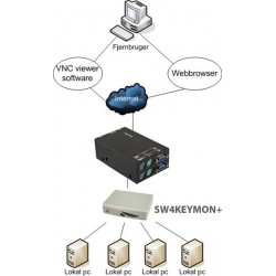 Til styring af flere pc’er kan SW-IP-REMOTE-A bruges sammen med en hvilken som helst KVM-omskifter, der kan styres af hot-keys, som f.eks. SW4KEYMON+. Pc’en der tilsluttes via LAN/WAN kan tilgå de på omskifteren tilsluttede pc’er via dens Web-browser eller VNC viewer. Der kan tilsluttes 1 sæt PS/2 tastatur, mus og VGA lokalt på boksen, så pc’en også kan styres lokalt. Opsætning foregå via Web-browser eller via lokalt mus, tastatur og VGA.