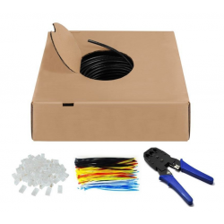 White outdoor Cat6. UTP network cable in the box with extension. Complete set consisting of cable, cable binders / strips, crimp and transparent RJ45 connectors.