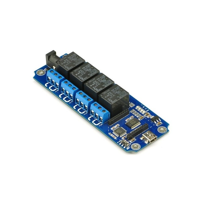Relä-kort med 4 st. reläer: styrd via USB- eller BT / WIFI-tilläggsmoduler