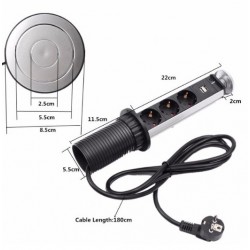 Övre diameter: 85mm. Hålskärning: 55mm. 3x uttag, 2x USB laddningsplugg (1000mA 5V). Kabellängd: 1 , 8 meter. Driftspänning: 250V. Effekt: 16 Amps. Max höjd når: 335mm. Material: Brandskyddsmaterial.